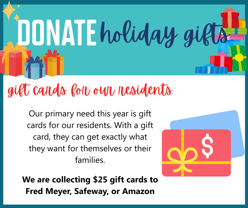 - Gifts for our individuals/families: Our primary need this year is gift cards for our residents! This way, they can get exactly what they want for themselves or their families, which is extremely empowering to them. You have two options to donate gift cards: